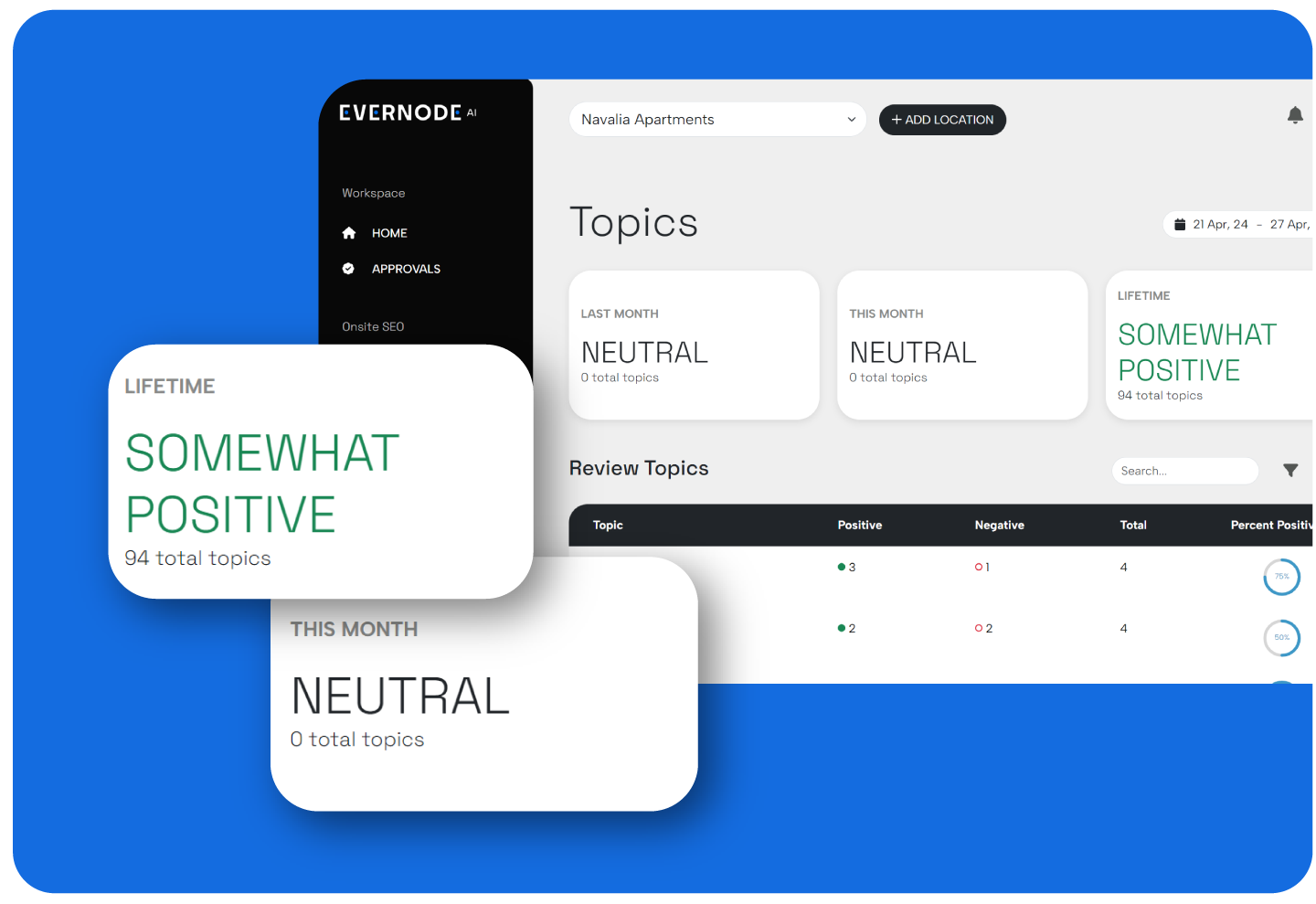 EvernodeAI seamlessly integrates sophisticated online reputation management into its dynamic, 'living' dashboard, providing you with a comprehensive overview of your brand's digital health. This integration allows for the tracking of your online reputation metrics, including review trends, sentiment analysis, and feedback across various platforms.