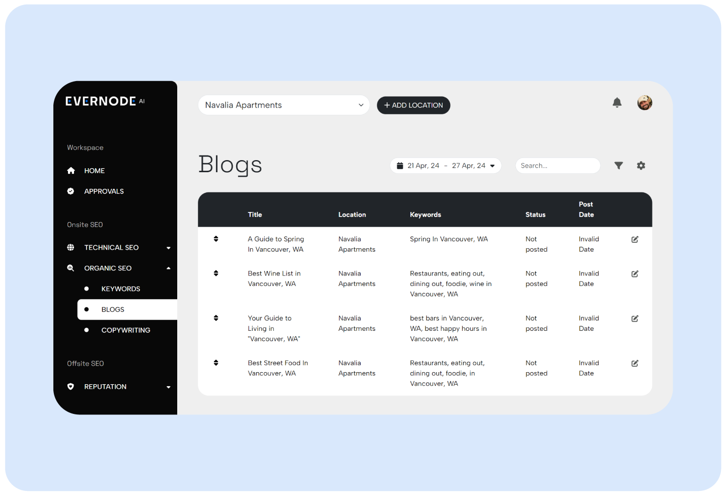 EvernodeAI possesses an exceptional ability to produce hyper-local blog articles that resonate with the unique voice and essence of each apartment community it represents. This capability stems from advanced AI algorithms that ensure that every piece of content feels genuinely connected to the community and its audience. This tailored approach not only strengthens the bond with current and prospective residents by reflecting their local experiences and interests but also significantly boosts local SEO performance.